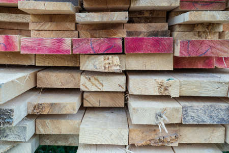 Close-up on the ends of stacked wooden planks. Wood grain is visible, some elements are marked in red. Background. Texture.