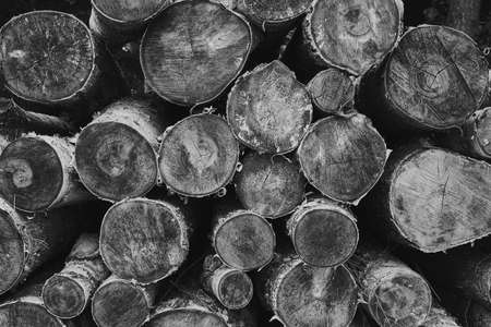 Dry chopped birch-tree logs stacked on top of each other. Black and white