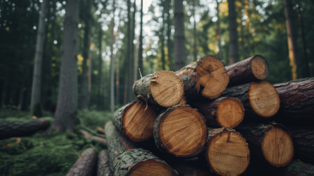 Stack of cut logs in a dense forest, close-up. Forestry and logging industry concept