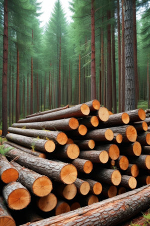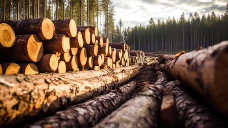 stored large wood in the forest, harvesting in an industrial way for industrial production