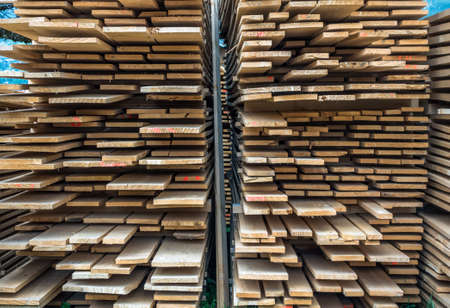 A large pile of boards sawn from trees on a sawmill for the procurement of building materials for construction. Construction industry.