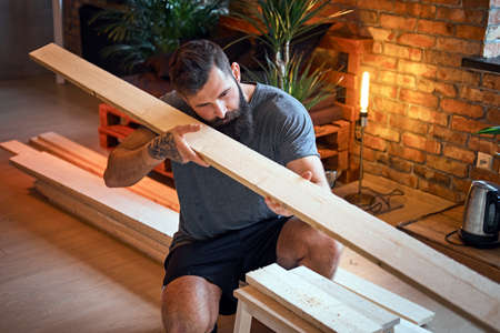 Bearded carpenter checks the boards in a loft room.