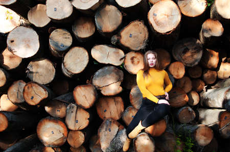 Beautiful young woman sitting on stack of felled tree trunks in the forest.