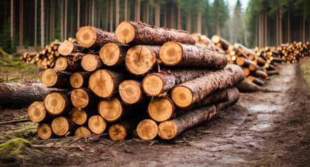 Forest pine trees log trunks felled by the logging timber industry round form
