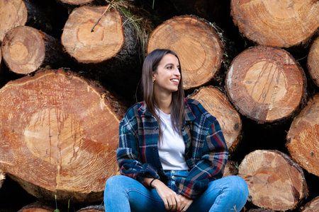 Girl sitting in front of some wooden logs. Concept wood, nature, sustainability.