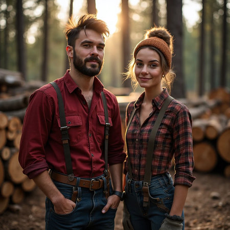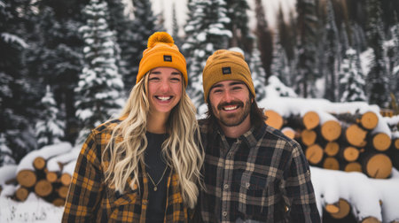 a man and woman, clad in cozy flannel shirts and beanie hats, stand proudly in front of towering stacks of cut trees, their smiles radiating warmth against the backdrop of a serene winter landscape