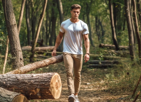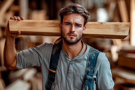 Woodworker showcases dedication and strength while carrying a wooden beam in a cozy workshop filled with timber. The warm atmosphere highlights craftsmanship and passion for traditional trades.