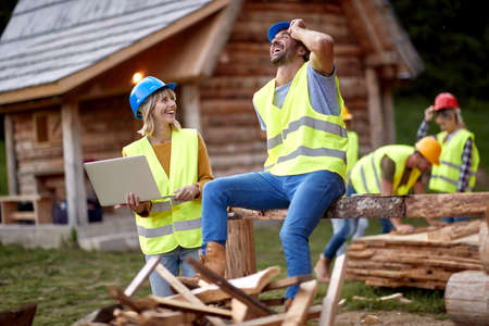 Supervisor female engineer control a construction site of wood frame house