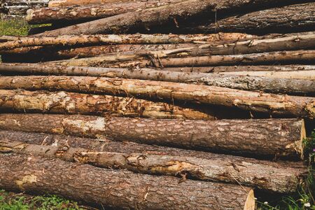 Closeup of logs of trees in nature. a lot of cutted logs.