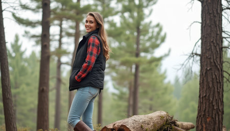 Smiling woman in a forest wearing a plaid shirt and vest