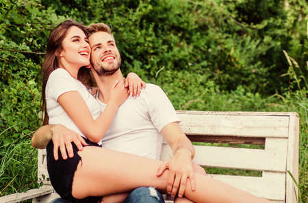 Cheerful couple. couple relax outdoor on bench. Secret place. man with woman in park. happy valentines day. summer camping in forest. family weekend. romantic date. couple in love. Happiness