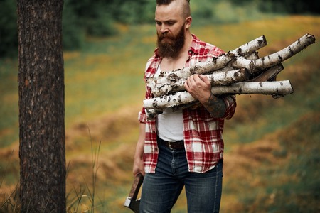 Bearded Man with firewoods and with axe on shoulder