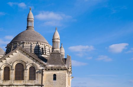 View from below of the Montmartre cathedral with its white domes on the blue sky
