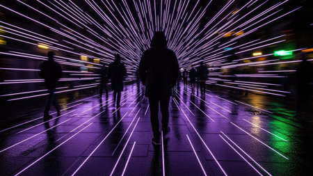 Pulsating neon light overlays create dynamic patterns against a dark background