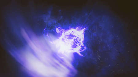 Abstract purple glowing energy magic bright high tech sphere ball circle in fire and smoke background.