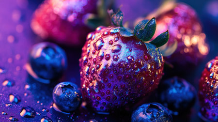 Close-up of glitter-covered strawberries and fresh blueberries on a sparkling surface, creating a dreamy, festive, fantasy-inspired food composition with rich textures and vivid colors