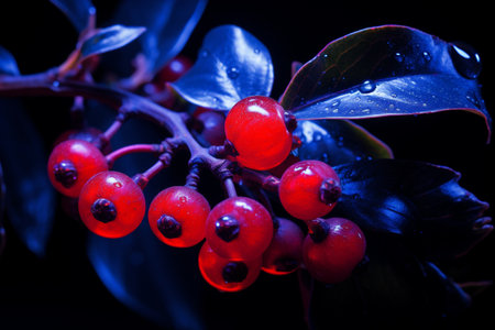 a branch adorned with vibrant red berries glistening with water droplets, captured in the artistic style of caras ionut. this enchanting photo, taken using ektachrome film, showcases a captivating blend of dark green and light cyan hues. the romantic scenery exudes a naive charm, while the luminosity of the water adds an ethereal touch. creative commons attribution. ai generated