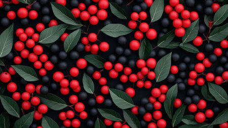 Lush and vibrant berry bush background with red berries and green leaves, creating a natural and organic pattern