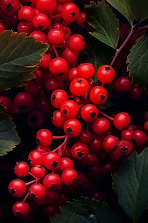 Close-up view of vibrant red berries nestled among lush green leaves, showcasing nature's beauty with rich colors and a serene atmosphere perfect for seasonal themes.