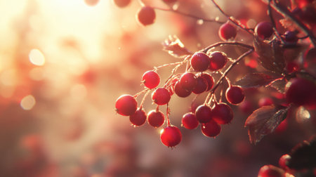 A stunning close-up view of ripe red berries hanging from branches, capturing the essence of nature during golden hour. The warm light creates a magical atmosphere.