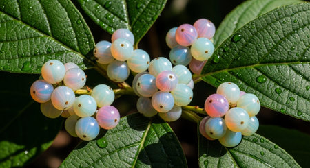 Fresh berry fruit on wet leaf, magnified in macro close up generated by artificial intelligence
