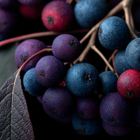 Deep Purple Serviceberries, Contrasting Close-up on a Dark Background with Purple Leaves