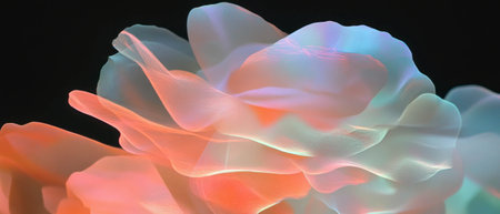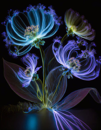 A mesmerizing abstract depiction of flowers with colorful light effects, showcasing delicate petal designs against a dark background, perfect for artistic projects.