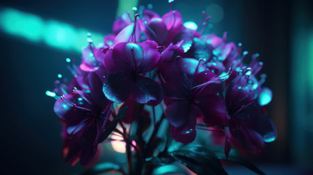 A stunning close-up of vibrant flowers adorned with dew drops, glowing beautifully at night. This artistic portrayal highlights nature's delicate charm.