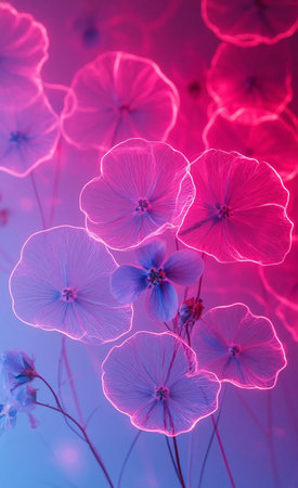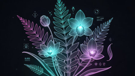 An illustration depicts glowing floral elements against a dark background. The artwork features outlines of flowers and foliage in shades of blue, green, and pink. Its composition suggests a digital creation suitable for various applications, including website graphics and design projects.