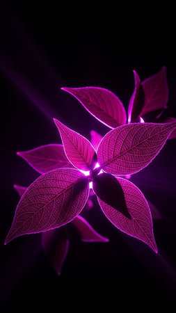 Magenta plant leaves with visible veins are illuminated from behind, creating a glowing effect against a dark background with subtle light rays.