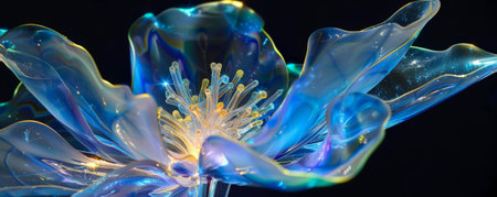 A delicate, abstract glass flower with transparent petals illuminated by neon blue light. The glowing edges create a striking contrast against the dark background, highlighting the intricate details of the flower.