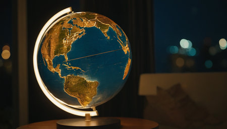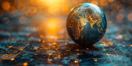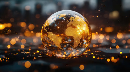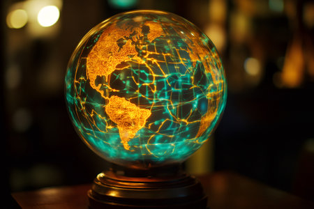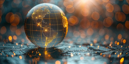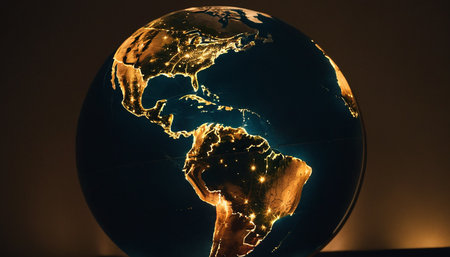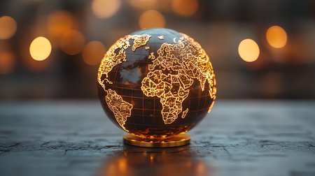Golden glass globe with a glowing map of the Americas, set against a background of warm bokeh lights and a reflective surface
