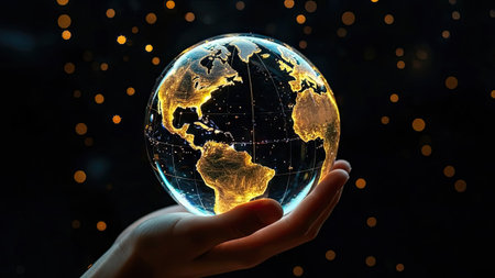 A digital representation of Earth is held in a human hand, presented against a dark backdrop. The globe features a vibrant, glowing design, highlighting landmasses. The composition incorporates a shallow depth of field, with soft bokeh lights. Suitable for commercial applications, including technology, science, and environmental themes.