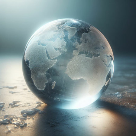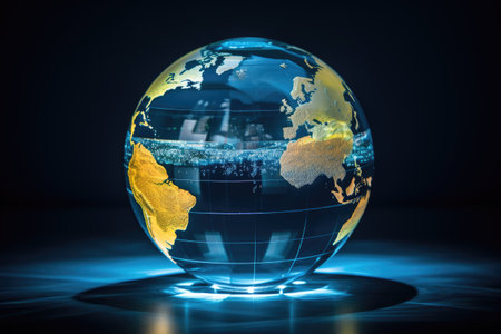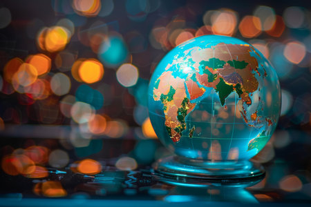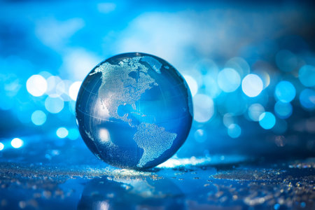 Crystal globe on a reflective surface with a vibrant blue bokeh background, symbolizing interconnectedness and the global network