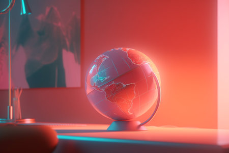 A globe sits on a table with a colorful background. The globe is illuminated and he is a decorative item