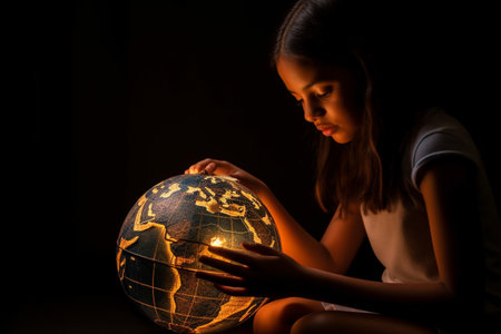 A close-up view depicts a hand cradling a luminous sphere, resembling Earth. The continents are illuminated, suggesting a nighttime perspective. The image utilizes a dark background, creating contrast. This visual could be utilized in various commercial projects, including editorials and design. The composition is centered, providing symmetry.