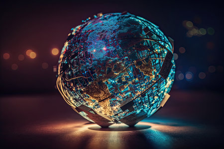 A captivating 3D representation of the Earth interconnected with glowing digital lines, symbolizing advanced technology and global connectivity in a modern landscape.