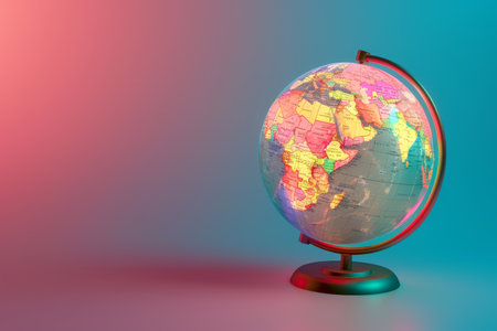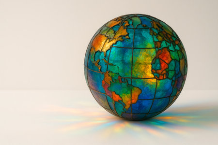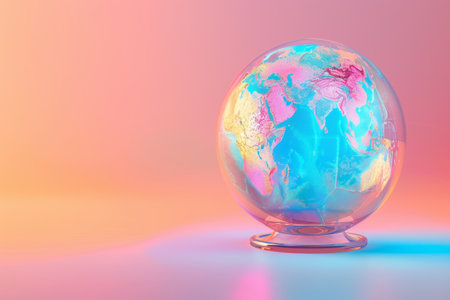 A globe is sitting on a table with a colorful background. The globe is clear and has colorful hue