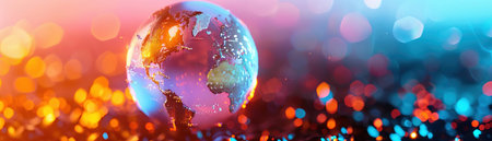A vibrant globe radiates with an array of multicolored lights, creating a festive atmosphere. Set against a bokeh background, the light display adds a playful and global touch to the scene.