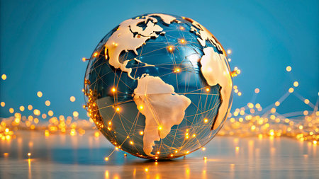 A globe showcases various countries linked by illuminated networks, symbolizing global connections and communication. The intricate pathways emphasize international relations and trade.