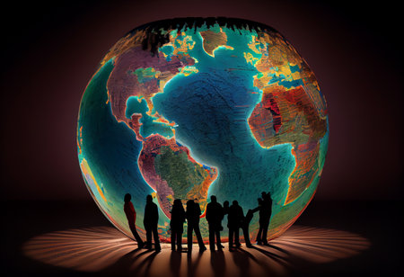 A group of people standing around a large globe with a map of the world on it global illumination a microscopic photo ecological art.