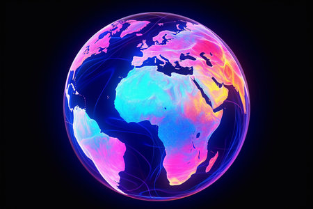 Neon light globe background. Modern lines earth banner. Abstract world glowing curves. Generative AI art