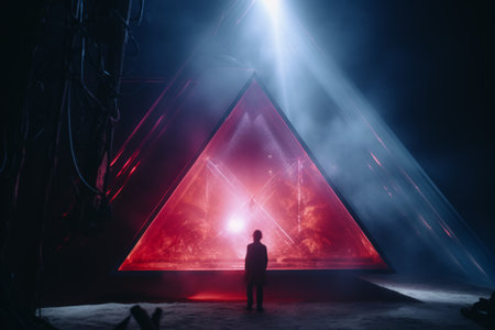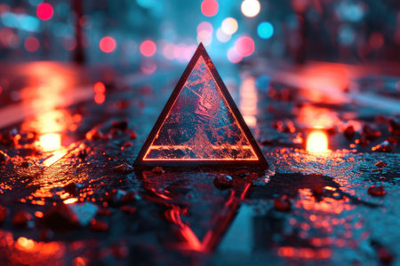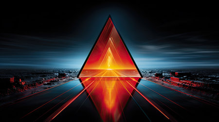 A captivating abstract image of a triangular shape with glowing red edges set against a dark textured surface, surrounded by blurred red lights and geometric elements.