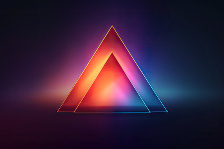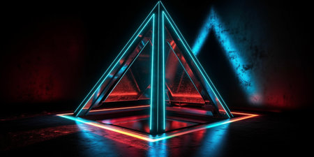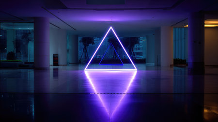 Bright neon lights form a stunning triangular pattern in dark surroundings. The vibrant colors reflect off surfaces, creating a captivating visual experience at night.