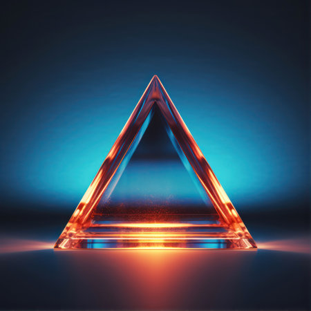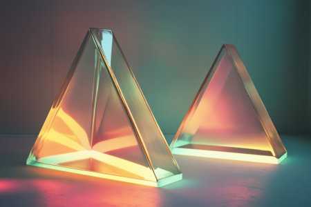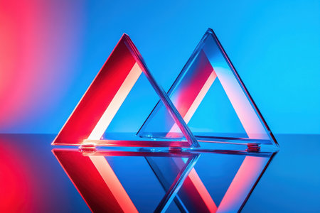 Glass prism triangles with vibrant red and blue lighting reflecting on glossy surface. Modern geometric abstract design. Contemporary color contrast art image.