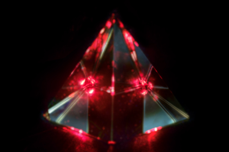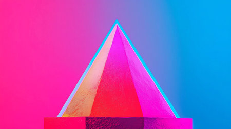 Rough-textured geometric pyramid with sharp edges, illuminated in vivid neon pink, red, and magenta, resting on a solid base.
