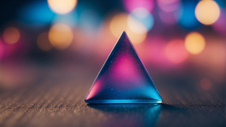 This captivating image features an iridescent triangle shape that reflects colorful light against a dark surface, creating a stunning visual effect.