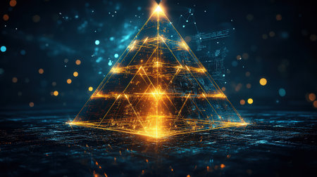An abstract pyramid made of glowing lines and dots, with ascending arrows symbolizing wealth and success