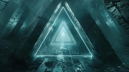 This stunning 3D image features a glowing triangular corridor against a dark, techinspired backdrop, evoking futuristic themes and captivating the viewers imagination and curiosity