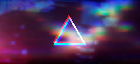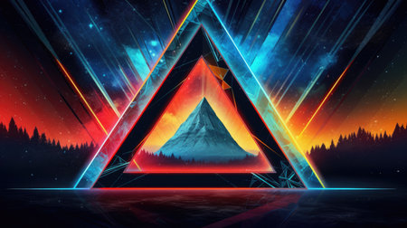Glowing neon triangle frame over abstract landscape. Generative AI image weber.